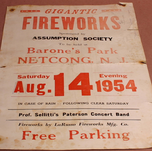 THE ASSUMPTION SOCIETY is a religious and social group made up of those of Italian heritage which staged gatherings around Catholic holidays. This 1954 event featured fireworks from the LaRusso family who had a fireworks plant on the east end of Main Street in Port Morris. |